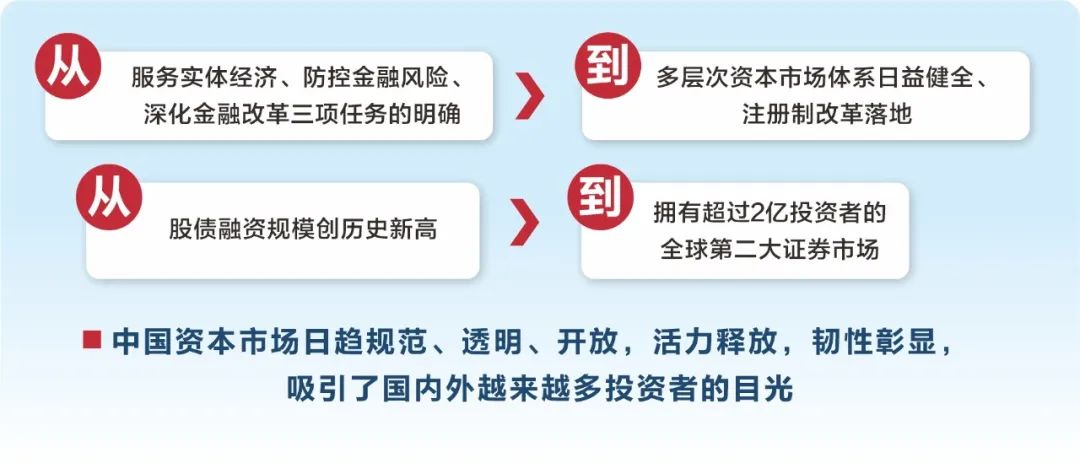 從服務(wù)實體經(jīng)濟、防控金融風(fēng)險、深化金融改革三項任務(wù)的明確,到多層次資本市場體系日益健全、注冊制改革落地;從股債融資規(guī)模創(chuàng)歷史新高,到擁有超過2億投資者的全球第二大證券市場,中國資本市場日趨規(guī)范、透明、開放,活力釋放,韌性彰顯,吸引了國內(nèi)外越來越多投資者的目光。