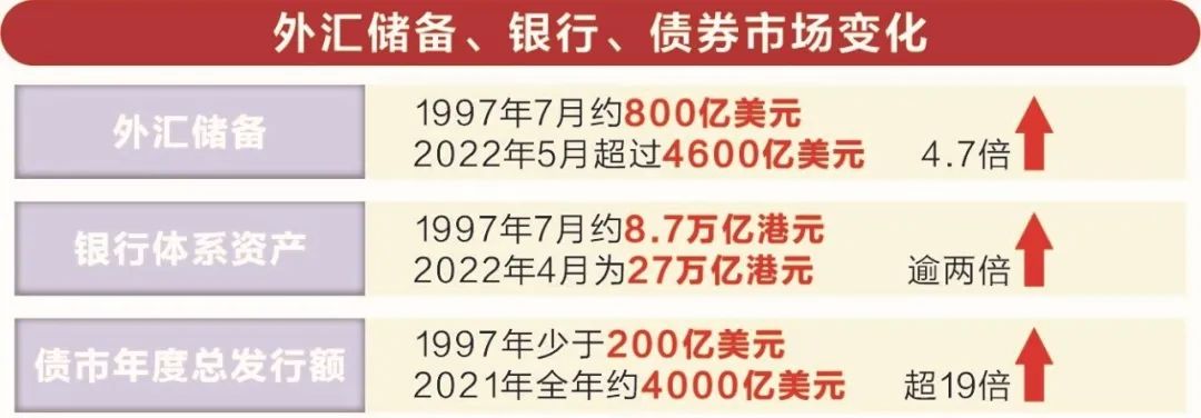 與此同時,香港作為國際金融中心的“內功”扎實。1997年7月,香港官方外匯儲備資產約800億美元,截至2022年5月底,香港官方外匯儲備資產為4650億美元,相當于香港流通貨幣6倍多;香港現在已經是全球最大離岸人民幣業(yè)務樞紐,處理全球75%離岸人民幣結算業(yè)務,去年經香港銀行處理的人民幣貿易結算量逾7萬億人民幣。