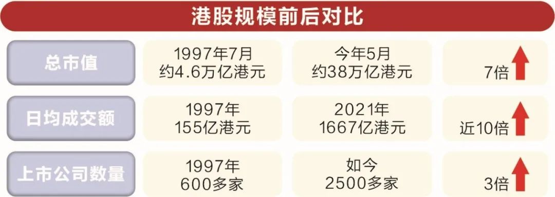 1997年7月,港股總市值約4.6萬億港元,今年5月約38萬億港元,漲幅7倍??偟膩砜矗?5年時間里,港股總市值最多甚至增逾10倍,回歸前后規(guī)模變化可謂是滄海桑田。港股日均成交額從1997年的155億港元,增至2021年的1667億港元,增長近10倍。