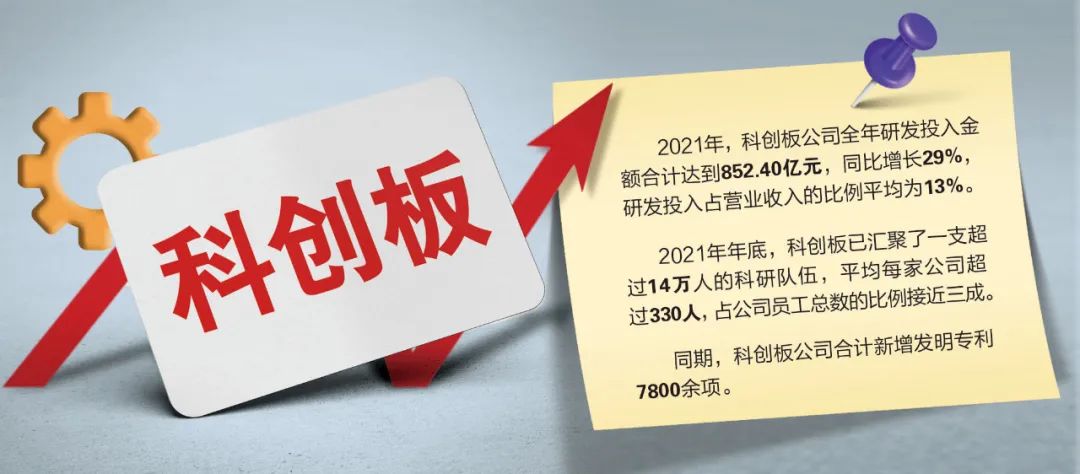 2021年,科創(chuàng)板公司研發(fā)強(qiáng)度保持高位,全年研發(fā)投入金額合計(jì)達(dá)到852.40億元,同比增長(zhǎng)29%,研發(fā)投入占營(yíng)業(yè)收入的比例平均為13%。2021年底,科創(chuàng)板已匯聚了一支超過(guò)14萬(wàn)人的科研隊(duì)伍,平均每家公司超過(guò)330人,占公司員工總數(shù)的比例接近三成。同期,科創(chuàng)板公司合計(jì)新增發(fā)明專(zhuān)利7800余項(xiàng)。