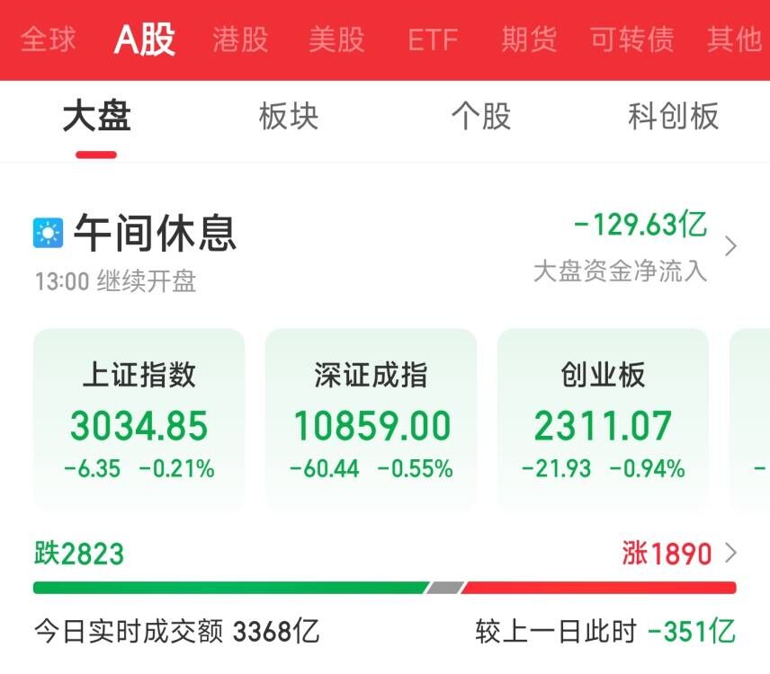 30日,A股三大指數(shù)高開(kāi)低走,集體翻綠后呈震蕩走勢(shì)。截至午間收盤(pán),上證指數(shù)跌0.21%,報(bào)3034.85點(diǎn);深證成指跌0.55%,報(bào)10859.00點(diǎn);創(chuàng)業(yè)板指跌0.94%,報(bào)2311.07點(diǎn)。滬深兩市所有交易個(gè)股漲跌比為1890:2823,兩市漲停29家,跌停7家。