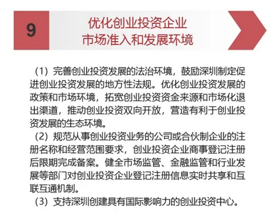 完善創(chuàng)業(yè)投資發(fā)展的法治環(huán)境,鼓勵深圳制定促進創(chuàng)業(yè)投資發(fā)展的地方性法規(guī)。優(yōu)化創(chuàng)業(yè)投資發(fā)展的政策和市場環(huán)境,拓寬創(chuàng)業(yè)投資資金來源和市場化退出渠道,推動創(chuàng)業(yè)投資雙向開放,營造有利于創(chuàng)業(yè)投資發(fā)展的生態(tài)環(huán)境;規(guī)范從事創(chuàng)業(yè)投資業(yè)務的公司或合伙制企業(yè)的注冊名稱和經(jīng)營范圍要求,創(chuàng)業(yè)投資企業(yè)商事登記注冊后限期完成備案。健全市場監(jiān)管、金融監(jiān)管和行業(yè)發(fā)展等部門對創(chuàng)業(yè)投資企業(yè)登記注冊信息實時共享和互聯(lián)互通機制;支持深圳創(chuàng)建具有國際影響力的創(chuàng)業(yè)投資中心。