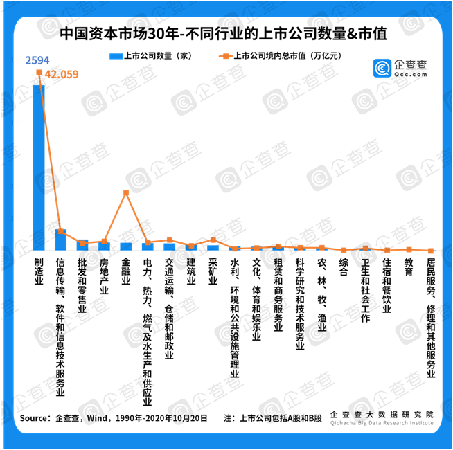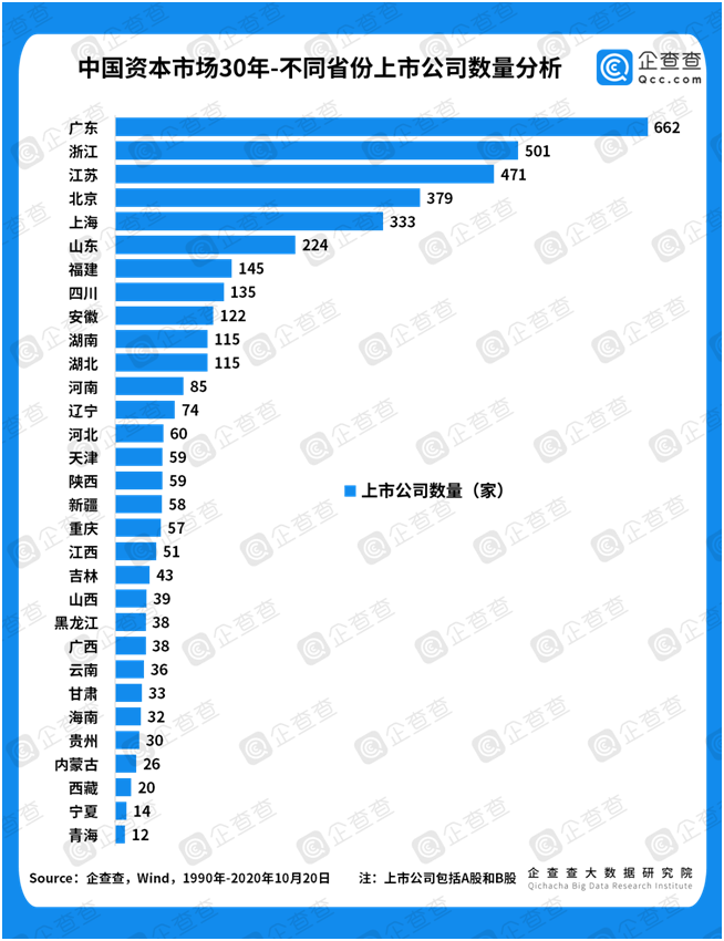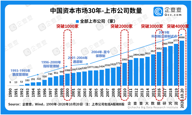 ①上市數(shù)量穩(wěn)增長(zhǎng)。談資本市場(chǎng),離不開上市公司,二者是魚與水的關(guān)系。企查查數(shù)據(jù)顯示,截至2020年10月20日,我國共有4066家上市公司。從30年來的發(fā)展軌跡來看,上市公司數(shù)量穩(wěn)步上升,從1990年的“老八股”,到1996年首次突破500家,2000年總數(shù)突破千家,歷時(shí)十年。2004年至今,隨著保薦制的全面實(shí)施,上市公司總數(shù)于2010年突破2000家,歷時(shí)十年;于2016年突破3000家,歷時(shí)六年。上市公司數(shù)量的穩(wěn)定增長(zhǎng),直接反映了中國資本市場(chǎng)的日益繁榮,只有在保證量變的基礎(chǔ)上,才有機(jī)會(huì)談質(zhì)變。2019年科創(chuàng)板開市,成為注冊(cè)制試點(diǎn);2020年6月,創(chuàng)業(yè)板注冊(cè)制開始施行,標(biāo)志著我國上市公司在量上將進(jìn)一步放開,并且終于迎來談?wù)撡|(zhì)變的時(shí)機(jī)。