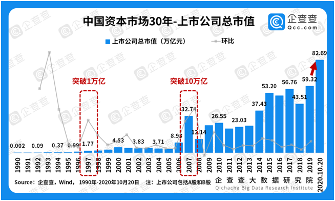 2020年是特殊的一年,諸如新冠疫情、中美關(guān)系新局面、特大洪澇災(zāi)害等不確定因素,考驗(yàn)著中國資本市場(chǎng)的韌性。不過,如果站在下一個(gè)30年后看今朝,當(dāng)下的中國經(jīng)濟(jì)又蘊(yùn)含著怎樣的發(fā)展機(jī)遇呢?帶著這樣的疑問,2020年10月,企查查推出《激蕩三十年 乘風(fēng)破浪時(shí)——中國資本市場(chǎng)30年大數(shù)據(jù)報(bào)告》,希望從大數(shù)據(jù)分析的角度,通過“成長(zhǎng)與變遷”、“大與強(qiáng)”兩對(duì)關(guān)系,回溯中國資本市場(chǎng)30年來的櫛風(fēng)沐雨。