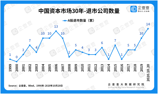 ③退市數(shù)量有序中見增長(zhǎng)。企查查數(shù)據(jù)顯示,自1999年至今,我國A股退市公司共119家??傮w來看,2004-2007年出現(xiàn)退市高峰,約有10余家,其余多數(shù)年份在1-3家左右。未來幾年或?qū)⒊霈F(xiàn)另一個(gè)退市高峰,2019年退市公司達(dá)到10家,2020年退市公司目前已14家。但是,我國資本市場(chǎng)與全球最大的資本市場(chǎng)美股相比,“吐故納新”的能力仍有差距,據(jù)公開數(shù)據(jù)顯示,1980-2017年,納斯達(dá)克和紐交所的年均退市企業(yè)數(shù)量為565家,美股累計(jì)上市公司數(shù)量26505家,累計(jì)退市公司數(shù)量14163家。