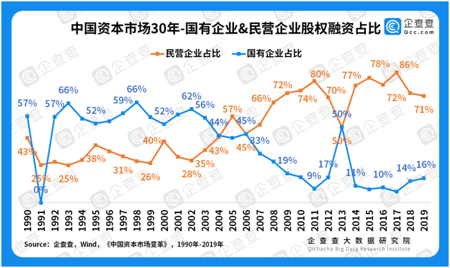 民營企業(yè)不斷壯大。我國資本市場(chǎng)曾長(zhǎng)期服務(wù)于國企融資、改革、轉(zhuǎn)型的需求,先后助力97年國企股份制改革、05年股份分置改革及14年以來的混合所有制改革。通覽中國資本市場(chǎng)30年的融資構(gòu)成,企查查發(fā)現(xiàn),2004年以前,國有企業(yè)融資占比均在50%以上,2006年之后,國有企業(yè)融資占比一路走低,從之前的50%降至10%左右。與此同時(shí),民營經(jīng)濟(jì)崛起,占比最高達(dá)80%左右。國企、民企的發(fā)展如同兩條此起彼伏、互相交織的曲線,一方面,國企的融資需求逐漸減少;另一方面隨著國家經(jīng)濟(jì)增長(zhǎng)進(jìn)入到新舊動(dòng)能轉(zhuǎn)換期,以民營企業(yè)為主的新興產(chǎn)業(yè)發(fā)展尋求巨大的資金支持。