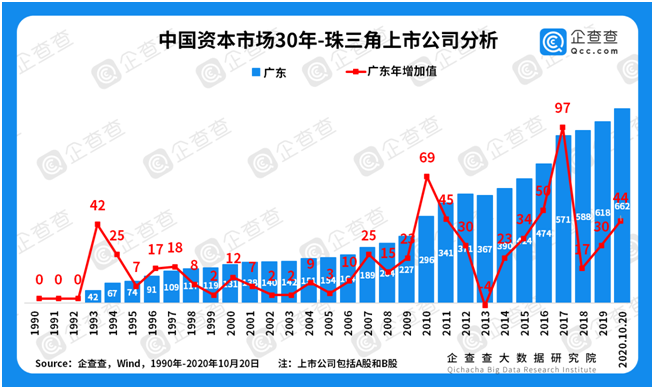 區(qū)域經(jīng)濟(jì)大變遷——珠三角、長(zhǎng)三角增長(zhǎng)曲線相近。由于珠三角擁有廣州、深圳兩大一線城市,因此也讓廣東毫無懸念地成為了上市企業(yè)最多的省份。企查查數(shù)據(jù)顯示,廣東省30年來的上市公司新增量分別在1993年(42家)、2010年(69家)與2017年(97家)經(jīng)歷了三次增長(zhǎng)高峰。