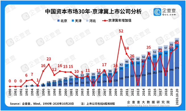 區(qū)域經(jīng)濟(jì)大變遷——京津冀上市公司年增量波動(dòng)最大。企查查數(shù)據(jù)顯示,京津冀地區(qū)出現(xiàn)了1997年(23家)、2010年(52家)兩個(gè)高峰。在2013年低谷期之后的6年,數(shù)據(jù)呈現(xiàn)出奇數(shù)年較高、偶數(shù)年較低的波動(dòng)狀態(tài)。