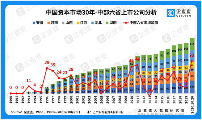 區(qū)域經(jīng)濟(jì)大變遷——中部六省“兩個(gè)駝峰”曲線。中部六省隨緊鄰東南沿海地區(qū),但六個(gè)省份的上市公司總數(shù)(498家)尚不敵廣東一?。?39家)。從30年變化趨勢(shì)來看,出現(xiàn)了“兩個(gè)駝峰”,第一個(gè)峰值在1996-2000年,第二個(gè)峰值在2010-2011年。從六省之間的比較分析來看,安徽、湖南、湖北上市公司數(shù)量接近,均為100多家,其次是河南、江西,山西上市公司數(shù)量最少。
