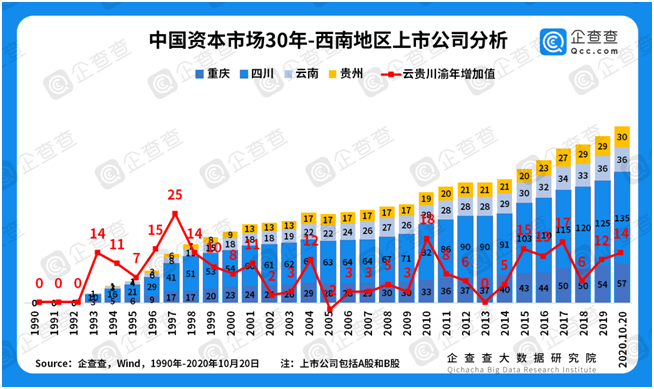區(qū)域經(jīng)濟(jì)大變遷——西南地區(qū)平穩(wěn)增長(zhǎng)。相比于長(zhǎng)三角等經(jīng)濟(jì)發(fā)達(dá)地區(qū),西南地區(qū)的上市公司數(shù)量整體偏低,但隨著區(qū)域經(jīng)濟(jì)模式的轉(zhuǎn)型升級(jí),上市企業(yè)近年來也保持著較平穩(wěn)的增長(zhǎng)率。企查查數(shù)據(jù)顯示,上世紀(jì)90年代云貴川渝四省份經(jīng)歷過兩次增長(zhǎng)高峰,1993年、1997年分別增長(zhǎng)14家、25家。2000-2009年這十年間,云貴川渝四省上市公司增加了48家,而2010-2019年增加了100家,兩個(gè)十年中環(huán)比增長(zhǎng)了108%。