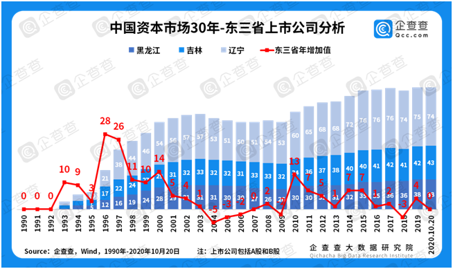 區(qū)域經(jīng)濟(jì)大變遷——東三省緩慢“衰退”。回顧中國資本市場(chǎng)30年,東三省的“衰退”是難以回避的話題。企查查數(shù)據(jù)顯示,東三省上市公司曾在1993-1994年、1996-1997年出現(xiàn)過兩次增長(zhǎng)高峰。彼時(shí),東三省受益于傳統(tǒng)重工業(yè)的產(chǎn)業(yè)優(yōu)勢(shì),迎來一波又一波上市潮。但進(jìn)入新世紀(jì)后,東三省年增量在2004-2006年期間連續(xù)出現(xiàn)三年的負(fù)增長(zhǎng),之后又在2009年、2018年出現(xiàn)兩次負(fù)值。1990-1999年這十年間,東三省上市企業(yè)共新增97家,但在2000-2019年這二十年間,上市企業(yè)僅新增60家。在中國經(jīng)濟(jì)整體保持高增長(zhǎng)率的大背景下,這樣的“反差”尤為引人深思。