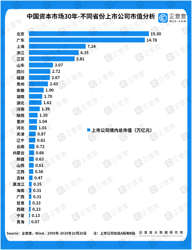 廣東上市公司數(shù)量最多,北京上市公司總市值最大。從各省份的上市公司數(shù)量來看,上市企業(yè)多集中于東南沿海省份及首都北京。其中,廣東省以662家上市企業(yè)居于第一,高出第二名浙江(501家)一百多家。江蘇(471家)、北京(379家)、上海(333家)、山東(224家)、福建(145家)分列3-7位。另一方面,在上市企業(yè)的市值排行榜上,北京以15.30萬億的總市值反超廣東(14.78萬億)坐上頭把交椅,上海(7.24萬億)、浙江(6.35萬億)、江蘇(5.81萬億)分列3-5位。而在兩份榜單上,西藏、寧夏、青海均位列最后三名。
