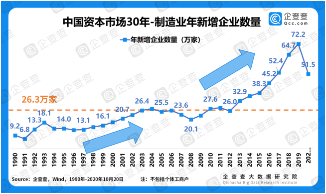 以2005年為分水嶺,實(shí)現(xiàn)兩個(gè)“飛躍”。企查查數(shù)據(jù)顯示,過去30年,我國制造業(yè)平均年新增企業(yè)注冊(cè)量26.3萬家,共約860萬家。以2005年為分水嶺,可劃分出兩個(gè)高速增長(zhǎng)期,2005年以前,平均年新增企業(yè)注冊(cè)量16萬家左右;2005年之后,平均年新增企業(yè)注冊(cè)量約36萬家。令人欣喜的是,由于過去30年的積累,制造企業(yè)年新增注冊(cè)曲線越來越陡峭,象征了我國制造業(yè)蓬勃的生命力。