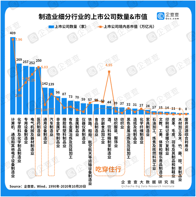 中國制造業(yè)不僅有總量,覆蓋領(lǐng)域亦很廣。在制造業(yè)31個(gè)細(xì)分領(lǐng)域中,計(jì)算機(jī)、通信和其他電子設(shè)備制造業(yè)以409家上市公司、7.96萬億元的總市值位列第一,大名鼎鼎的“芯片”行業(yè)就位于此。此外,有近一半制造業(yè)細(xì)分領(lǐng)域與“吃穿住行”密切相關(guān),例如醫(yī)藥制造業(yè)總市值5.03萬億,酒、飲料和精制茶制造業(yè)總市值4.55萬億,分別排名市值榜單的第二、三位。不管是與民生密切相關(guān)的制造業(yè),還是事關(guān)“民族底氣”的制造業(yè),我國兩手抓、都很硬。