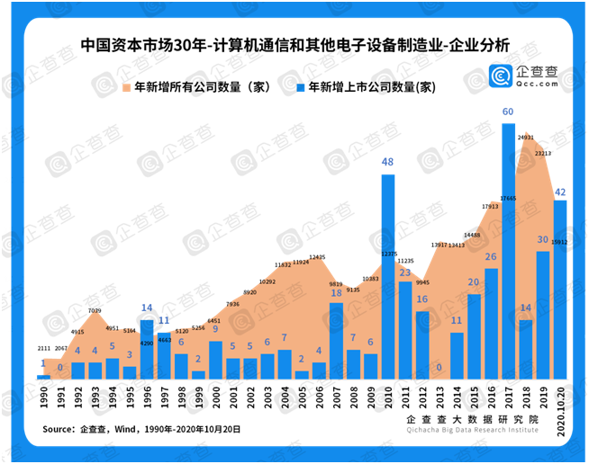 中國制造業(yè)不僅覆蓋范圍廣,更在關(guān)鍵領(lǐng)域儲(chǔ)備了大量后備軍。聚焦于計(jì)算機(jī)、通信和其他電子設(shè)備制造業(yè),企查查數(shù)據(jù)顯示,1990年計(jì)算機(jī)、通信和其他電子設(shè)備制造業(yè)僅有1家上市公司、2111家公司,但是截至2020年10月,該行業(yè)已有409家上市公司、31萬家公司。也就是說,過去30年,平均每年新增上市公司12家,平均每年新增公司10127家!一個(gè)擁有31萬家企業(yè)作為后備軍的計(jì)算機(jī)、通信和其他電子設(shè)備制造業(yè),未來勢(shì)必能孵化出更多的上市公司,創(chuàng)造出千帆競(jìng)發(fā)的壯觀。