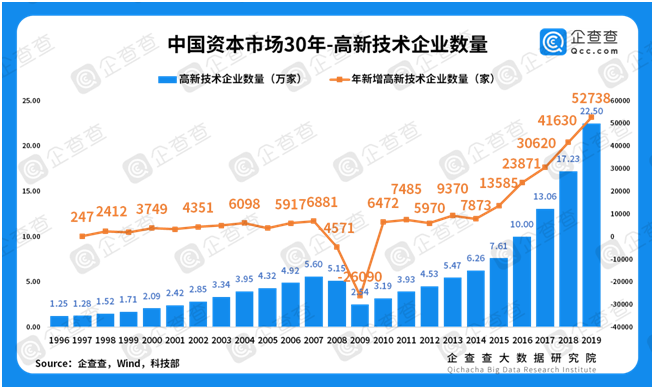 我國是進(jìn)擊中的科技大國。1991年,國務(wù)院批準(zhǔn)全國26個(gè)高新技術(shù)產(chǎn)業(yè)開發(fā)區(qū)為國家高新技術(shù)產(chǎn)業(yè)開發(fā)區(qū)。同年,國家科委發(fā)布《國家高新技術(shù)產(chǎn)業(yè)開發(fā)區(qū)高新技術(shù)企業(yè)認(rèn)定條件和辦法》,開啟了我國高新技術(shù)企業(yè)認(rèn)證之路。我國的這場(chǎng)科技突圍賽,早在30年前打響,這與我國資本市場(chǎng)的組建節(jié)點(diǎn)驚人的一致。企查查數(shù)據(jù)顯示,我國平均每年新增高新技術(shù)企業(yè)9000多家;根據(jù)科技部發(fā)布的數(shù)據(jù),截至2019年底,全國高新技術(shù)企業(yè)達(dá)到22.5萬家。