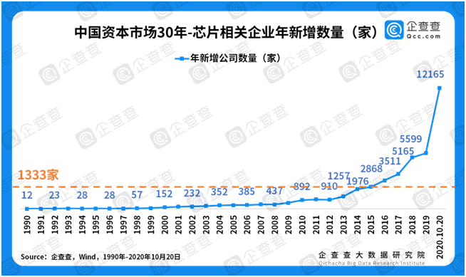 政策利好助力芯片行業(yè)迎來春天。2020年8月4日,國務(wù)院發(fā)布《關(guān)于印發(fā)新時(shí)期促進(jìn)集成電路產(chǎn)業(yè)和軟件產(chǎn)業(yè)高質(zhì)量發(fā)展若干政策的通知》,宣布符合條件的企業(yè)將免征企業(yè)所得稅10年。國家政策的大力扶持,勢(shì)必推動(dòng)芯片行業(yè)迎來春天。企查查數(shù)據(jù)顯示,過去30年我國平均每年新增芯片相關(guān)企業(yè)1333家,截至2020年10月,共有芯片企業(yè)4.9萬家。從上世紀(jì)90年代,每年僅新增幾十家芯片企業(yè),到近10年,增速越來越快,增加值越來越大,今年到目前新增注冊(cè)量1.2萬家。企查查大數(shù)據(jù)研究院預(yù)測(cè),政策的助力將推動(dòng)芯片行業(yè)本就十分陡峭的增長(zhǎng)曲線將更加陡峭,該行業(yè)將展現(xiàn)出指數(shù)級(jí)增長(zhǎng)的潛力。