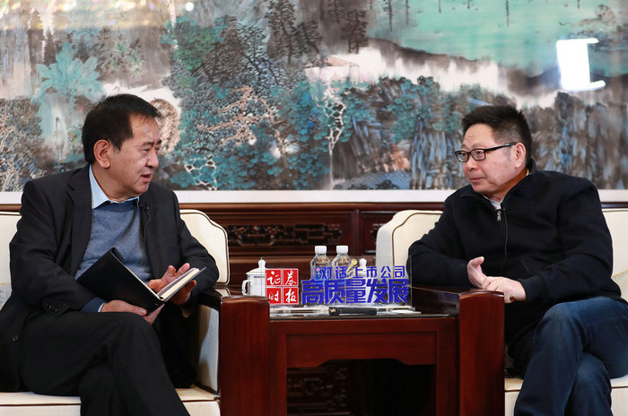 證券時報副總編輯高峰(左)對話湖南廣播電視臺黨委副書記、副臺長、總編輯、湖南廣播影視集團有限公司黨委副書記、總經理、芒果超媒股份有限公司黨委書記、董事長張華立(右)